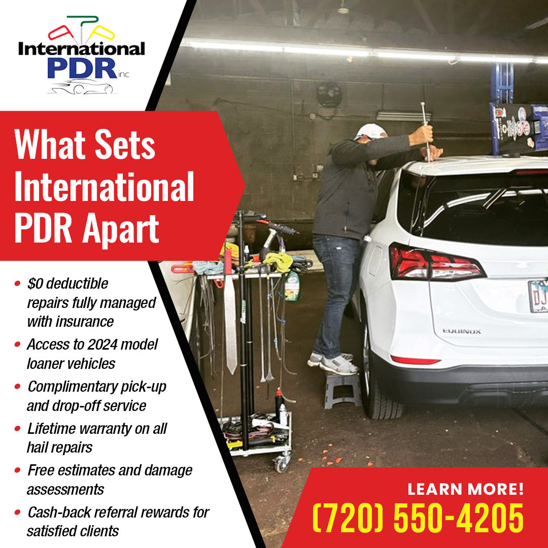 International PDR is a Colorado-based automotive repair center specializing in auto hail damage repair services in Arvada. The team offers environmentally friendly paintless dent repair backed by a lifetime warranty, 2024 loaner vehicles, and zero-deductible insurance coverage. With over five decades of combined experience, International PDR is known for clear communication, fast turnaround, and high-quality workmanship. Contact them today at (720) 550-4205 or Contact@InternationalPDR.com to learn more.